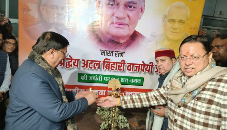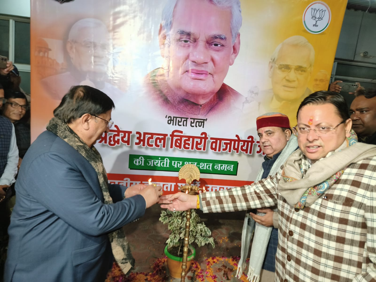 कार्यक्रम के दौरान सीएम धामी ने स्वर्गीय अटल जी के चित्र पर पुष्प अर्पित उनकी याद में दीपक जलाया। इस दौरान उन्होंने पूर्व पीएम की सरकार के कार्यकाल को मजबूत राष्ट्र निर्माण की दिशा निर्धारित करने वाला बताया। सुशासन के साथ विकास का जो मूल मंत्र उन्होंने स्थापित किया, वह भाजपा की सभी सरकारों के लिए मार्गदर्शन और दिशा निर्देशिका का काम कर रहा है। स्वयं पीएम मोदी के नेतृत्व में एनडीए सरकार भी उनकी नीतियों का अनुशरण करते हुए विकसित भारत निर्माण की दिशा में तेजी से आगे बढ़ रही है। संगठन के लिए उनका सम्पूर्ण जीवनकालखंड, वैचारिक एवं सैद्धांतिक एनसाइक्लोपीडिया की तरह है। उनका व्यक्तिगत जीवन, पार्टी के लिए श्रेष्ठ कार्यकर्ता और जागरूक नागरिक निर्माण का प्रेरणादायक मानदंड है।