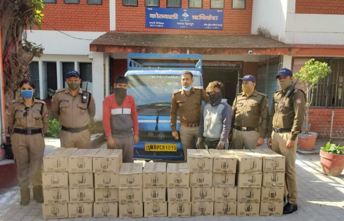 जानकारी के अनुसार कल देर शाम कोतवाली ऋषिकेश व एसओजी टीम को सूचना मिली कि क्षेत्र में कुछ शराब तस्कर अवैध शराब डिलीवरी हेतू आने वाले है। सूचना पर कार्यवाही करते हुए पुलिस ने क्षेत्र में चैकिंग अभियान चला दिया। इस दौरान पुलिस को देहरादून रोड फ्लाई ओवर के समीप एक संदिग्ध छोटा हाथी वाहन आता हुए दिखायी दिया। पुलिस ने जब उसके चालक को रूकने का इशारा किया तो चालक व उसके साथ बैठा एक अन्य व्यक्ति भागने का प्रयास करने लगे। इस पर उन्हे घेर कर दबोचा गया। छोटा हाथी वाहन की तलाशी के दौरान पुलिस ने उसमें रखी 37 पेटी अंग्रेजी शराब बरामद की। कोतवाली लाकर की गयी पूछताछ में उन्होने अपना नाम अभय कीरत सिंह नेगी पुत्र स्वर्गीय बालम सिंह नेगी निवासी मोहल्ला श्यामपुर थाना प्रेमनगर व राजकुमार उर्फ अमन पुत्र भरत बहादुर निवासी नयागांव थाना पटेल नगर देहरादून बताया। पुलिस ने दोनो तस्करों के खिलाफ आबकारी अधिनियम की धाराओं में मुकदमा दर्ज कर उन्हे न्यायालय में पेश कर दिया है।