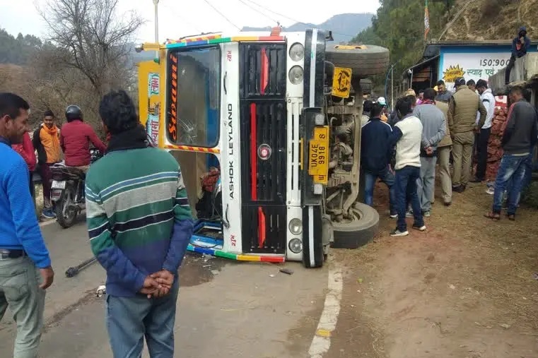 जानकारी के अनुसार रविवार सुबह चालक ने ट्रक को सड़क किनारे मिट्टी के ढेर में उतार दिया। जिससे ईंटों से भरा ट्रक सड़क के बीच पलट गया। इस दौरान सड़क पर कोई और वाहन मौजूद नहीं था। जिसके कारण बड़ा हादसा होने से टल गया। ट्रक पलटने से सोमेश्वर-रानीखेत मार्ग पर दोनों ओर वाहनों की लंबी कतार लग गई। जाम में दर्जनों वाहन फंसे हुए हैं। जिनमें रानीखेत, द्वाराहाट, हल्द्वानी, कौसानी, गरुड़, बागेश्वर तथा ग्वालदम आदि शहरों को आने जाने वाले यात्री खासे परेशान हैं। थानाध्यक्ष अजेंद्र प्रसाद के नेतृत्व में पुलिस कर्मी सड़क से ट्रक को हटाने के प्रयास में जुटे हुए हैं। दोपहिया वाहनों की आवाजाही फिलहाल शुरू कर दी गई है, सड़क अभी भी बड़े वाहनों के लिए बंद है। जिसके कारण यात्री परेशान हो रहे हैं।