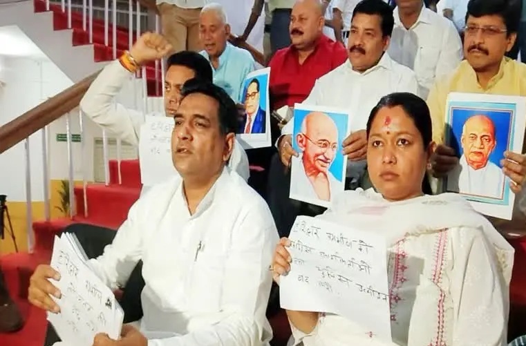 विधानसभा सत्रः कानून व्यवस्था को लेकर कांग्रेस ने सदन के बाहर किया प्रदर्शन