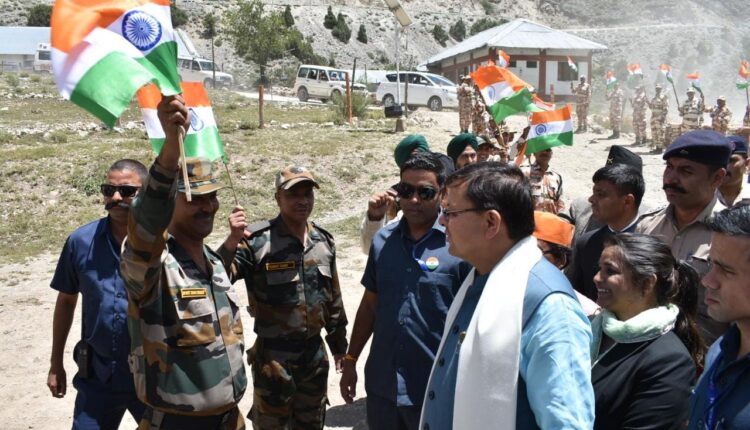 देहरादून। मुख्यमंत्री पुष्कर सिंह धामी ने बुधवार को सीमांत गांव मलारी में भारतीय सेना, आईटीबीपी (हिमवीर), सीमांत सड़क संगठन (शिवालिक) के जवानों और द्वितीय रक्षा पंक्ति के रूप में सीमांत गांव के निवासियों के साथ हर घर तिरंगा कार्यक्रम में प्रतिभाग किया और सभी का हौसला बढ़ाते हुए आजादी के अमृत महोत्सव की बधाई दी। हर घर तिरंगा कार्यक्रम को लेकर सेना के जवानों और सीमांत गांवों के निवासियों में जबरदस्त उत्साह और उमंग दिखा। सीमांत गांव मलारी में आयोजित हर घर तिरंगा कार्यक्रम में सेना के जवानों के साथ ही सीमांत गांव कैलाश पुर, महरगांव, कोषा, द्रोणागिरी, नीति, बांम्पा, गमशाली, फरकिया, झेलम, जुम्मा, कागा, गरपक, मलारी के लोगों ने हर्षोल्लास से प्रतिभाग लिया।