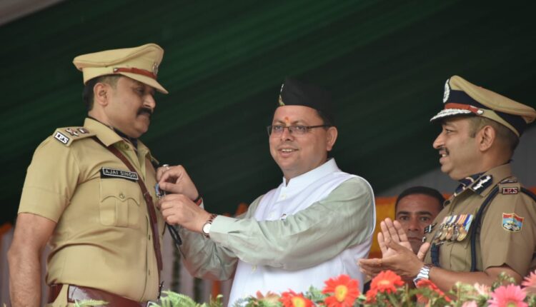 देहरादून। मुख्यमंत्री पुष्कर सिंह धामी ने स्वतंत्रता की 75वीं वर्षगांठ के अवसर पर परेड ग्राउण्ड देहरादून में राज्य के मुख्य कार्यक्रम में ध्वजारोहण किया। इस अवसर पर मुख्यमंत्री ने पुलिस अधिकारियों एवं कर्मचारियों को विशिष्ट कार्यों के लिए मुख्यमंत्री सराहनीय सेवा पदक प्रदान किया। पुलिस उप महानिरीक्षक श्री सेंथिल अबूदई कृष्णराज एस., उपनिरीक्षक श्रीमती रेखा दानू, श्री कृपाल सिंह एवं मुख्य आरक्षी श्री वेद प्रकाश भट्ट को मुख्यमंत्री सराहनीय सेवा पदक प्रदान किया गया। भ्रष्टाचार पर जीरो टॉलरेंस की नीति के क्रम में यूकेएसएससी परीक्षा धांधली की जॉच कर रही वरिष्ठ पुलिस अधीक्षक श्री अजय सिंह के नेतृत्व में एस.टी.एफ. की टीम को भी मुख्यमंत्री ने मुख्यमंत्री सराहनीय सेवा पदक प्रदान किया। वरिष्ठ पुलिस अधीक्षक एस.टी.एफ. श्री अजय सिंह, उप निरीक्षक श्री दिलवर सिंह, श्री नरोत्तम बिष्ट, श्री उमेश कुमार एवं श्री विपिन बहुगुणा को मुख्यमंत्री सराहनीय सेवा पदक प्रदान किया गया। इस अवसर पर मुख्यमंत्री ने स्वतंत्रता संग्राम सेनानियों के परिजनों को सम्मानित किया एवं फोटो प्रदर्शनी का अवलोकन भी किया।