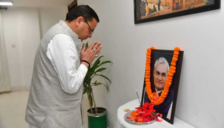 मुख्यमंत्री श्री पुष्कर सिंह धामी ने पूर्व प्रधानमंत्री स्व. श्री अटल बिहारी वाजपेई जी की पुण्य तिथि पर उनके चित्र पर पुष्पांजलि अर्पित कर श्रद्धांजलि दी।