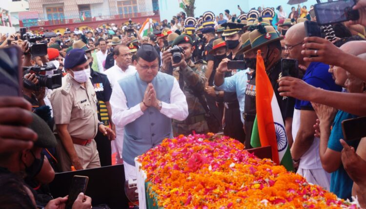 मुख्यमंत्री श्री पुष्कर सिंह धामी ने 1984 में सियाचिन में आपरेशन मेघदूत के दौरान शहीद हुए लांसनायक चन्द्रशेखर हर्बोला के पार्थिव देह पर पुष्प चक्र अर्पित कर श्रद्धांजलि दी।