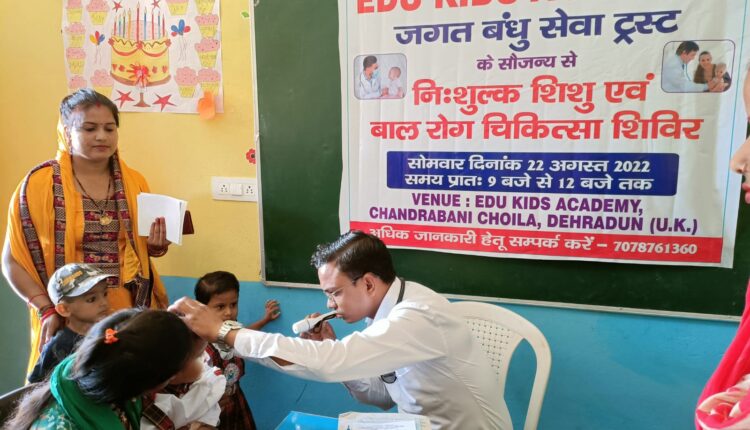 एडु किड्स अकैडमी एवं जगतबंधु सेवा ट्रस्ट के सौजन्य से निशुल्क शिशु एवं बाल रोग चिकित्सा शिविर का आयोजन एडु किड्स एकेडमी चंद्रबनी में किया गया l जिसमें बाल रोग विशेषज्ञ डॉक्टर अंकुश गुप्ता के द्वारा बच्चों की जांच कर निशुल्क परामर्श दिया गया l शिविर में स्कूल के साथ-साथ चंद्रबनी के क्षेत्र वासियों के द्वारा भी शिविर का लाभ उठाया गया l शिविर में 165 बच्चों का निशुल्क जांच कि गयी एवं साथ में आए माता-पिता को परामर्श दिया गया l स्कूल प्रधानाचार्य सुशीला संनवार के द्वारा बताया गया कि समय समय पर स्वास्थ्य शिविर का आयोजन होता रहता है एवं क्षेत्रवासियों को स्वास्थ्य से संबंधित जानकारी देना इत्यादि सेवाओं से क्षेत्रवासियों को लाभान्वित करते रहते हैं l जगतबंधु सेवा ट्रस्ट के वेलफेयर डायरेक्टर दिलीप कुमार शर्मा, सुनील शाह एवं स्कूल डायरेक्टर श्रीं बहादुर संनवार के द्वारा डॉ अंकुर गुप्ता को सेवा संकल्प अवार्ड से भी सम्मानित किया गया l डॉक्टर के द्वारा सभी क्षेत्रवासियों को बच्चों में लगने वाली मौसम संबंधी बीमारियों के विषय में जागरूक किया एवं जांच कर उन्हें निशुल्क परामर्श भी दिया गया l