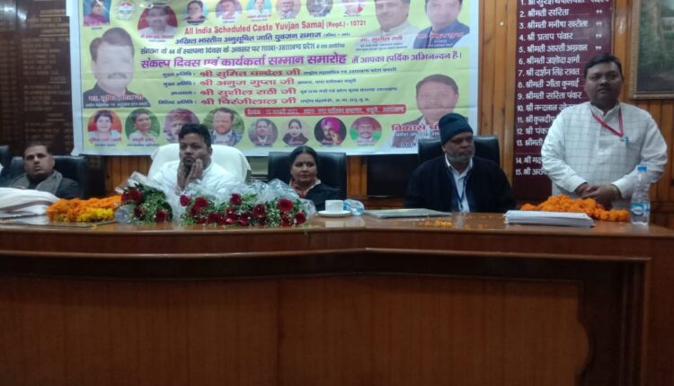 राष्ट्रीय महासचिव सुमित चंदेल ने कार्यकर्ताओं को संकल्प दिलाया और प्रतिज्ञा के रूप में सभी कार्यकर्ताओं ने संकल्प लिया कि हम सब लोग मिलकर शिक्षा, संगठन और संघर्ष पर जोर दिया। इसी क्रम में कार्यकर्ता सम्मान समारोह के तहत युवजन समाज के कार्यकर्ताओं को नगर पालिका के अध्यक्ष अनुज गुप्ता एवं पूर्व राज्य मंत्री सुशील राठी एवं संगठन के राष्ट्रीय महामंत्री चिरंजीलाल ने 2022 में सक्रिय रहकर संगठन के माध्यम से संगठन के कार्यक्रमों को अगरसर करने के लिए कार्यकर्ताओं को प्रशस्ति पत्र देते हुए 2022-23 के अवार्ड से सम्मानित किया। इस अवसर पर कार्यक्रम की अध्यक्षता कर रहे पूर्व राज्यमंत्री सुशील राठी ने कहा कि हम एससी, एसटी, ओबीसी के विकास ओर उत्थान के लिए हम सदैव तत्पर रहें। कार्यक्रम में प्रदेश अध्यक्ष विकास चौहान, मधु थापा, सुरेश पटेल, सुरेश यादव, माधुरी टम्टा, मसूरी शहर अध्यक्ष भरत लाल, रमेश लाल टम्टा, राम पाल भारती, कृष्णा गोदियाल, प्रताप सिंह, पूजा ढींगरा, तनमित खालसा, शुभम कोठारी, सलीम अहमद, अजय उर्फ राजू, राजेश शर्मा, सुशीला देवी, प्रतिमा देवी, सरतमा देवी, आशा थापा, राजश्री भाटिया, फूलवती देवी, कौशल्या देवी, रवि, कृष्णा देवी, विनोद कुमार, पास्टर देवेन्द्र कुमार, जलीश कुरैशी, उर्मिला बचवान, यशवीर सिंह यादव, दया शंकर यादव, वेद प्रकाश यादव आदि मौजूद रहे।