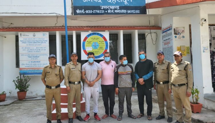 पकड़े गए आरोपियों में प्रशांत जुयाल पुत्र स्वर्गीय धीरज जुयाल निवासी शिवकुटी क्लेमेंट टाउन, अजय शर्मा पुत्र मोहन लाल शर्मा निवासी डोईवाला, मनीष कुमार पुत्र स्वर्गीय रामपाल सिंह निवासी चंदर रोड डालनवाला, मोहन थापा पुत्र स्वर्गीय रविंदर सिंह निवासी न्यू बस्ती क्लेमेंट टाउन बताए जा रहे है।