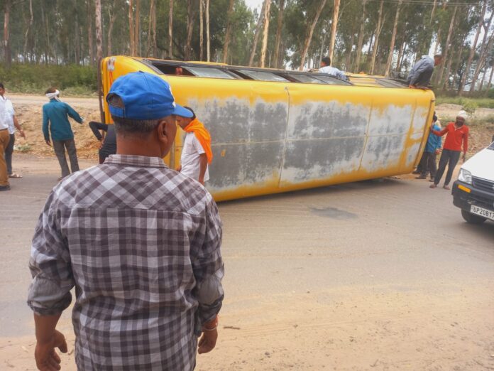 अनियंत्रित होकर सड़क पर पलटी स्कूल बस,बाल-बाल बचे शिक्षक