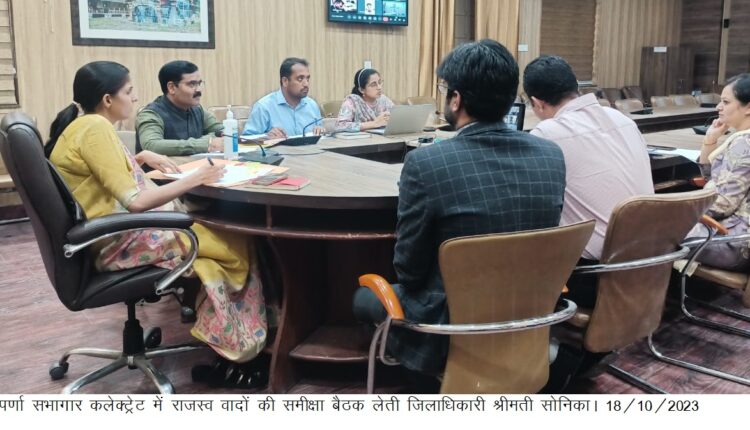 जिलाधिकारी श्रीमती सोनिका ने ऋषिपर्णा सभागार कलेक्टेªट में राजस्व वादों की समीक्षा बैठक करते हुए।