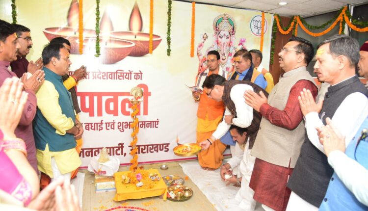 देहरादून। मुख्यमंत्री पुष्कर सिंह धामी दीपावली के अवसर पर बलबीर रोड़ स्थित प्रदेश भाजपा कार्यालय में आयोजित दीपावली महोत्सव कार्यक्रम में शामिल हुए। इस अवसर पर मुख्यमंत्री ने माता लक्ष्मी और श्री गणेश जी का पूजन कर प्रदेश की खुशहाली की कामना की।