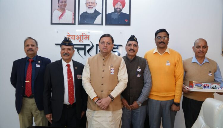 मुख्यमंत्री आवास में सैनिक कल्याण एवं पुनर्वास निदेशालय के निदेशक ब्रिगेडियर अमृत लाल (से.नि.) उप निदेशक कर्नल एम.एस.जोधा (से.नि) ने मुख्यमंत्री पुष्कर सिंह धामी को फ्लैग लगाया।