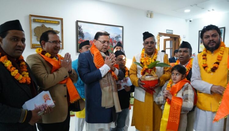अयोध्या में राम मंदिर प्राण प्रतिष्ठा समारोह से पूर्व शुक्रवार को मुख्यमंत्री आवास में अक्षत वितरण टोली के सदस्यों द्वारा श्री राम मंदिर, अयोध्या से लाए गए पूजित अक्षत, राम मंदिर का चित्र एवं निमंत्रण पत्रक मुख्यमंत्री पुष्कर सिंह धामी को भेंट किये गये।