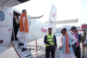देहरादून। मुख्यमंत्री पुष्कर सिंह धामी ने मंगलवार को नैनी सैनी एयरपोर्ट से पिथौरागढ़-देहरादून हवाई सेवा का शुभारंभ किया व स्वयं भी हवाई जहाज में बैठकर देहरादून रवाना हुए। मुख्यमंत्री ने इस हवाई सेवा प्रारंभ होने पर सभी को बधाई दी उन्होंने प्रधानमंत्री नरेंद्र मोदी व नागरिक उड्डयन मंत्री श्री ज्योतिरादित्य सिंधिया का आभार भी व्यक्त किया। उन्होंने कहा उत्तराखंड धार्मिक पर्यटन की दृष्टि से अति महत्वपूर्ण राज्य है। यहां पर धार्मिक पर्यटन व प्राकृतिक पर्यटकों का आना-जाना सहजता से हो, इसके लिए हवाई सेवा अति आवश्यक है। पहले पिथौरागढ़ से देहरादून, दिल्ली जाने में 17 घंटे लगते थे। मोदी जी के प्रयास से ऑल वेदर सड़क बनने से देहरादून, दिल्ली 11 घंटे लगते हैं, सीमांत जिले में हवाई सेवा प्रारंभ होने के बाद 1 घंटे में देहरादून पहुंच सकते हैं।