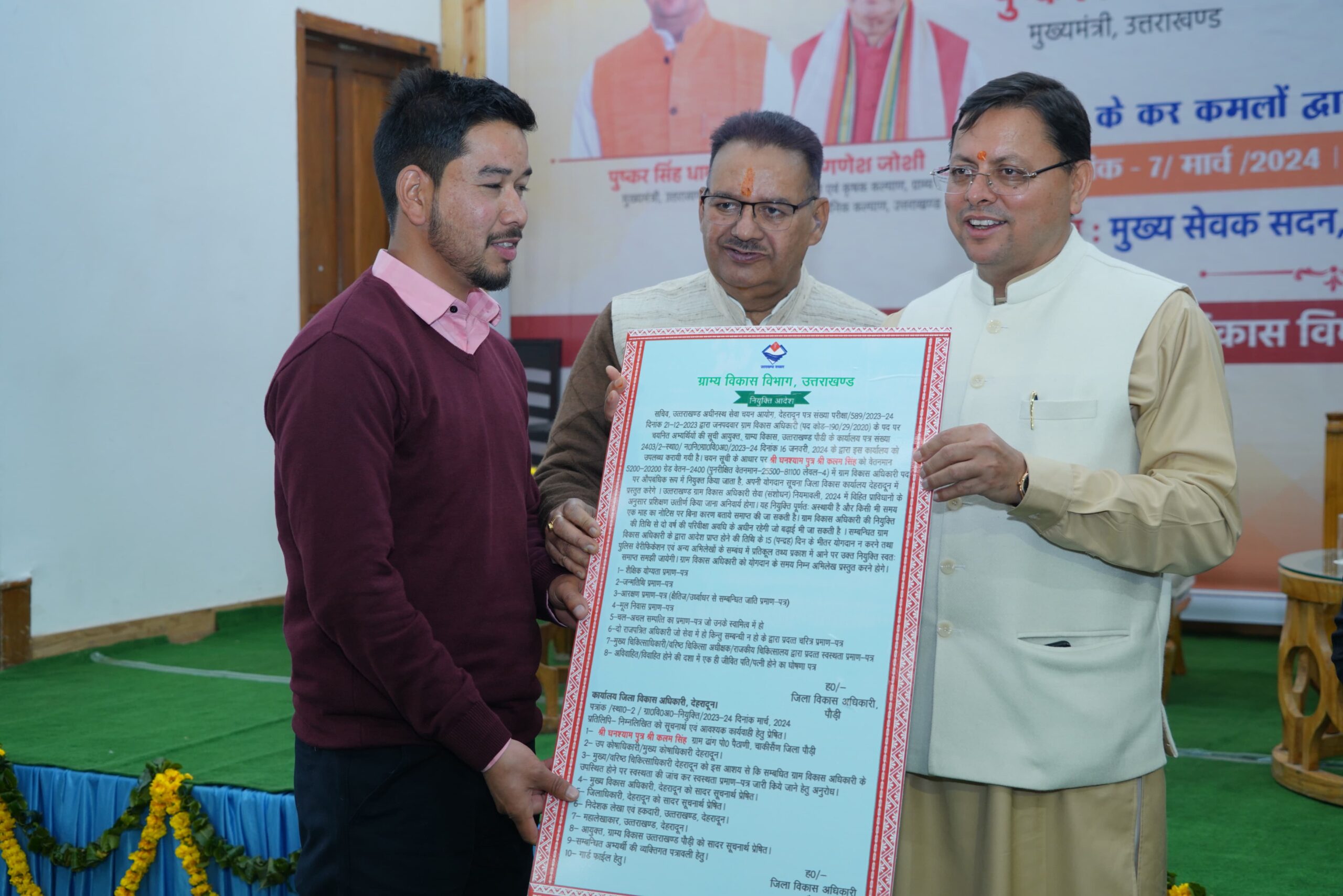 देहरादून। मुख्यमंत्री पुष्कर सिंह धामी ने गुरुवार को मुख्य सेवक सदन में ग्राम विकास विभाग के अंतर्गत अधीनस्थ चयन सेवा आयोग के माध्यम से चयनित 394 ग्राम विकास अधिकारियों के पद पर नियुक्त अभ्यर्थियों को नियुक्ति पत्र प्रदान किये।