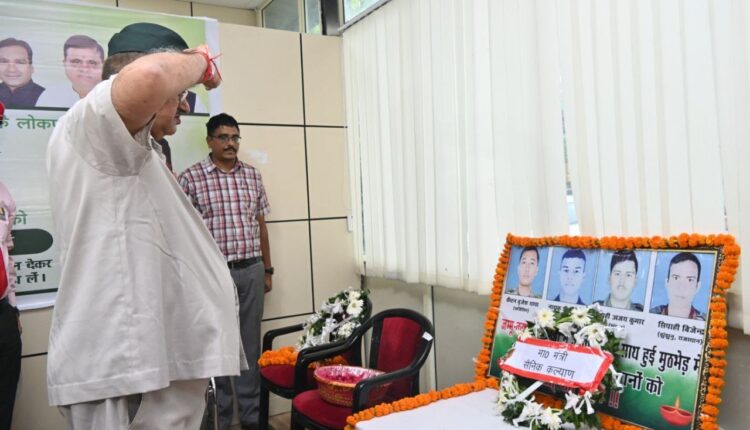 देहरादून,। सैनिक कल्याण मंत्री गणेश जोशी ने जम्मू के उरार बागी, डोडा में आतंकियों के साथ मुठभेड़ के दौरान शहीद हुए भारतीय सेना के जवानों की शहादत पर हाथी बड़काला स्थित कैंप कार्यालय में आयोजित श्रद्धांजली कार्यक्रम में प्रतिभाग कर शहीदों को पुष्पचक्र अर्पित कर भावपूर्ण श्रद्धांजलि दी।