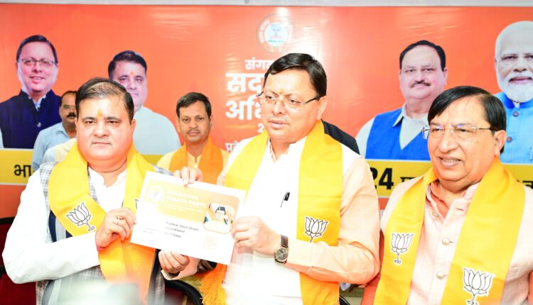 देहरादून। मुख्यमंत्री पुष्कर सिंह धामी ने मंगलवार को बलवीर रोड स्थित भाजपा प्रदेश कार्यालय में भारतीय जनता पार्टी के ’संगठन पर्व, सदस्यता अभियान 2024’ के तहत प्रदेश भाजपा के प्रथम सदस्य के रूप में सदस्यता ग्रहण की।