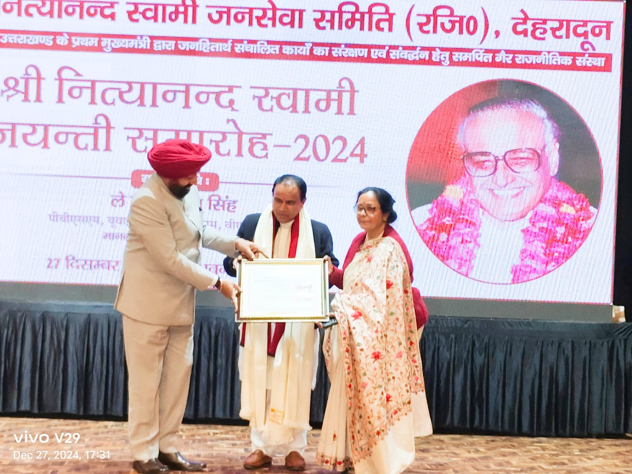 प्रदेश के प्रथम मुख्यमंत्री नित्यानंद स्वामी जी की 96वीं जयंती के अवसर आज राजभवन में श्री नित्यानंद स्वामी जनसेवा समिति द्वारा एक भव्य कार्यक्रम का आयोजन किया गया। जिसमें प्रदेश के राज्यपाल लेफ्टिनेंट जनरल (से.नि.) श्री गुरमीत सिंह बतौर मुख्य अतिथि सम्मिलित हुये। इस विशेष कार्यक्रम में श्री नित्यानंद स्वामी जनसेवा समिति द्वारा विभिन्न क्षेत्रों में अपना अमूल्य योगदान देने वाले महानुभावों को सम्मानित किया गया। इस अवसर पर समिति द्वारा प्रदेश के युवा कैबिनेट मंत्री डॉ. धन सिंह रावत को उनकी साफ-सुथरी राजनीतिक छवि के लिये उन्हें ‘‘स्वच्छ राजनीतिज्ञ सम्मान’’ से सम्मानित किया गया। जिसे उन्होंने राज्यपाल के हाथों ग्रहण किया। सम्मान समारोह को सम्बोधित करते हुये डॉ. रावत ने कहा कि “श्री नित्यानंद स्वामी जी के आदर्श और समाज सेवा के प्रति उनका समर्पण हम सभी के लिए प्रेरणा स्रोत है। यह सम्मान मुझे समाज और प्रदेश की भलाई के लिए और अधिक निष्ठा और समर्पण के साथ कार्य करने के लिए प्रेरित करेगा।“ उन्होंने कहा कि नित्यानंद स्वामी छात्र राजनीति से उभरे हुये राजनेता थे। उनका जीवन संघर्षों से भरा रहा। वह प्रदेश के ऐसे राजनेता थे जो जनहितैषी और उदार छवि के थे, सादगी, कर्तव्यनिष्ठा और ईमानदारी के कारण उनका सम्मान पक्ष और विपक्ष के सभी लोग किया करते थे। डॉ. रावत ने कहा कि हमें स्वामी जी के पद चिन्हों पर चल कर राजनीतिक सुचिता के साथ जनसेवा करना चाहिये, यहीं उन्हें सच्ची श्रद्धांजलि होगी। डॉ. रावत ने इस सम्मान के लिए श्री नित्यानंद स्वामी जनसेवा समिति का आभार व्यक्त करते हुए, इस सम्मान को समाज सेवा के प्रति अपनी प्रतिबद्धता का प्रतीक बताया।