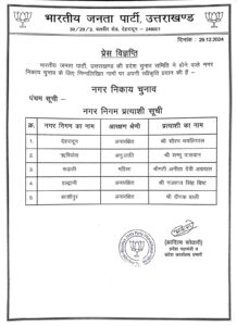 भाजपा ने जारी किये मेयर प्रत्याशियों की सूची By administration Last updated Jun 5, 2025 देहरादून। भाजपा ने मेयर पद के लिए 5 प्रत्याशियों की घोषणा कर दी है। Facebook Twitter LinkedIn WhatsApp