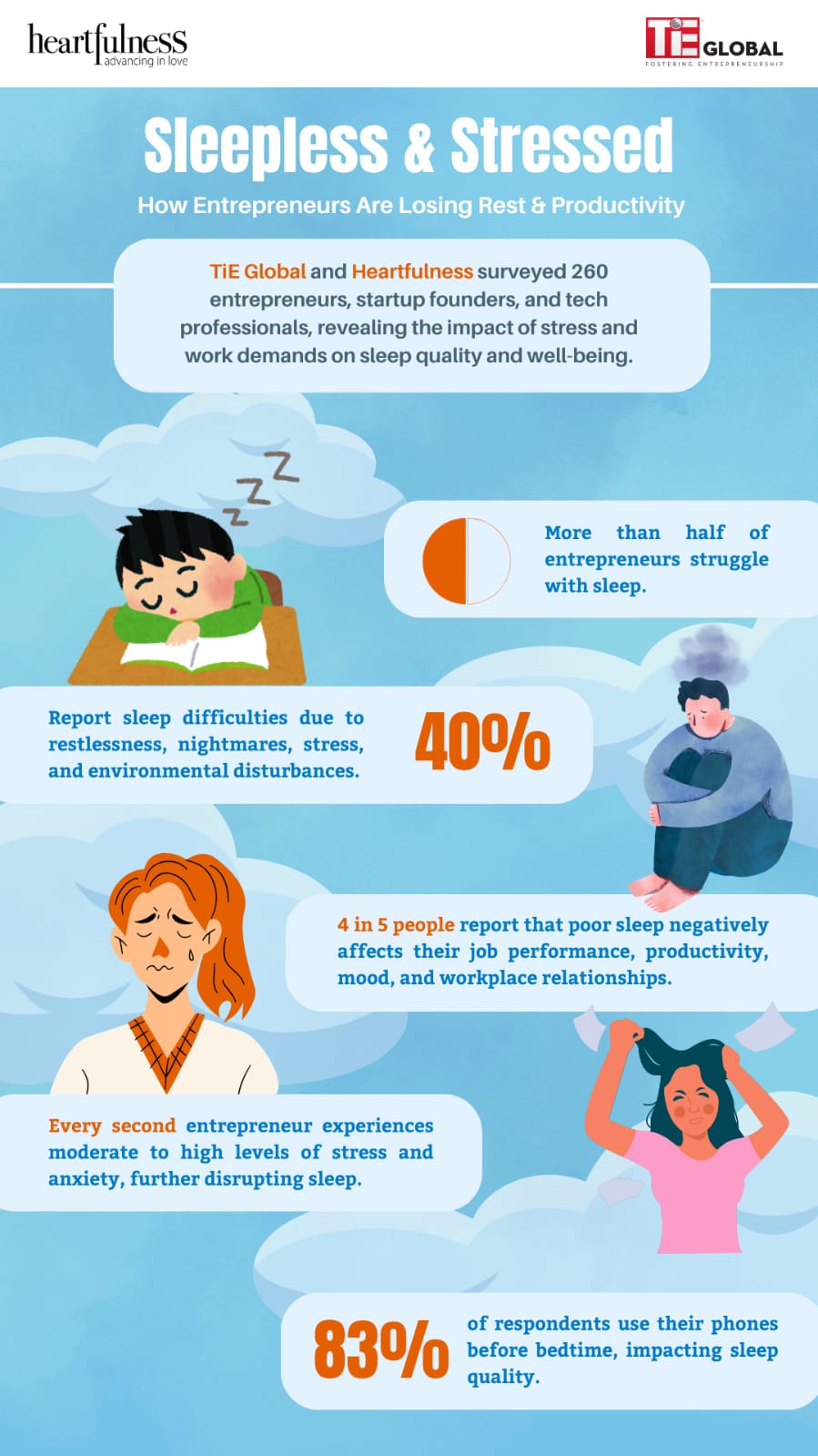 टी.आई.ई. ग्लोबल बोर्ड ऑफ ट्रस्टीज के अध्यक्ष मुरली बुक्कापटनम ने भी अपने विचार साझा किए: “उद्यमी और स्टार्टअप संस्थापक अक्सर सफलता की तलाश में नींद का त्याग करते हैं, लेकिन यह सर्वेक्षण उत्पादकता, निर्णय लेने और समग्र प्रदर्शन पर नींद की कमी के ठोस प्रभाव को उजागर करता है। टी.आई.ई. ग्लोबल दुनिया भर में हमारे अध्यायों को ये कार्यशालाएँ प्रदान करने में हार्टफुलनेस के साथ साझेदारी करने के लिए उत्साहित है। साथ मिलकर हम ऐसे संसाधन प्रदान करने के लिए प्रतिबद्ध हैं जो उद्यमियों को एक स्वस्थ कार्य-जीवन संतुलन प्राप्त करने में सहायता करते हैं, जो स्थायी सफलता की कुंजी है।”