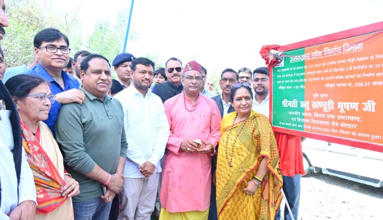 विधानसभा अध्यक्ष ऋतु खण्डूडी भूषण ने कोटद्वार विधानसभा क्षेत्र के अंतर्गत हल्दुखाता–सिगड्डी मोटर मार्ग में तेली स्रोत रपटे पर ₹236.31 लाख की लागत से 30 मीटर स्पान के डबल लेन आर.सी.सी. पुल का भूमि पूजन कर शिलान्यास किया।