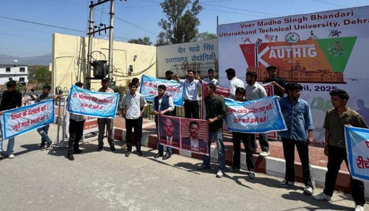 देहरादून – ।, वीर माधो सिंह भडारी उत्तराखंड तकनीकी विश्विद्यालय में चल रहे फ़र्ज़ी डिग्री जाँच प्रकरण, भ्रस्टाचार, वित्तीय अनिमिताओ की शिकायतो एवम इंजीनियरिंग कॉलेज गोपेश्वर के डायरेक्टर अमित अग्रवाल की फ़र्ज़ी डिग्री को लेकर डी.ए.वी. छात्र संघ अध्यक्ष सिद्धार्थ अग्रवाल के नेतृत्व में पिछले एक माह से छात्र सड़को पर संघर्ष रत है !