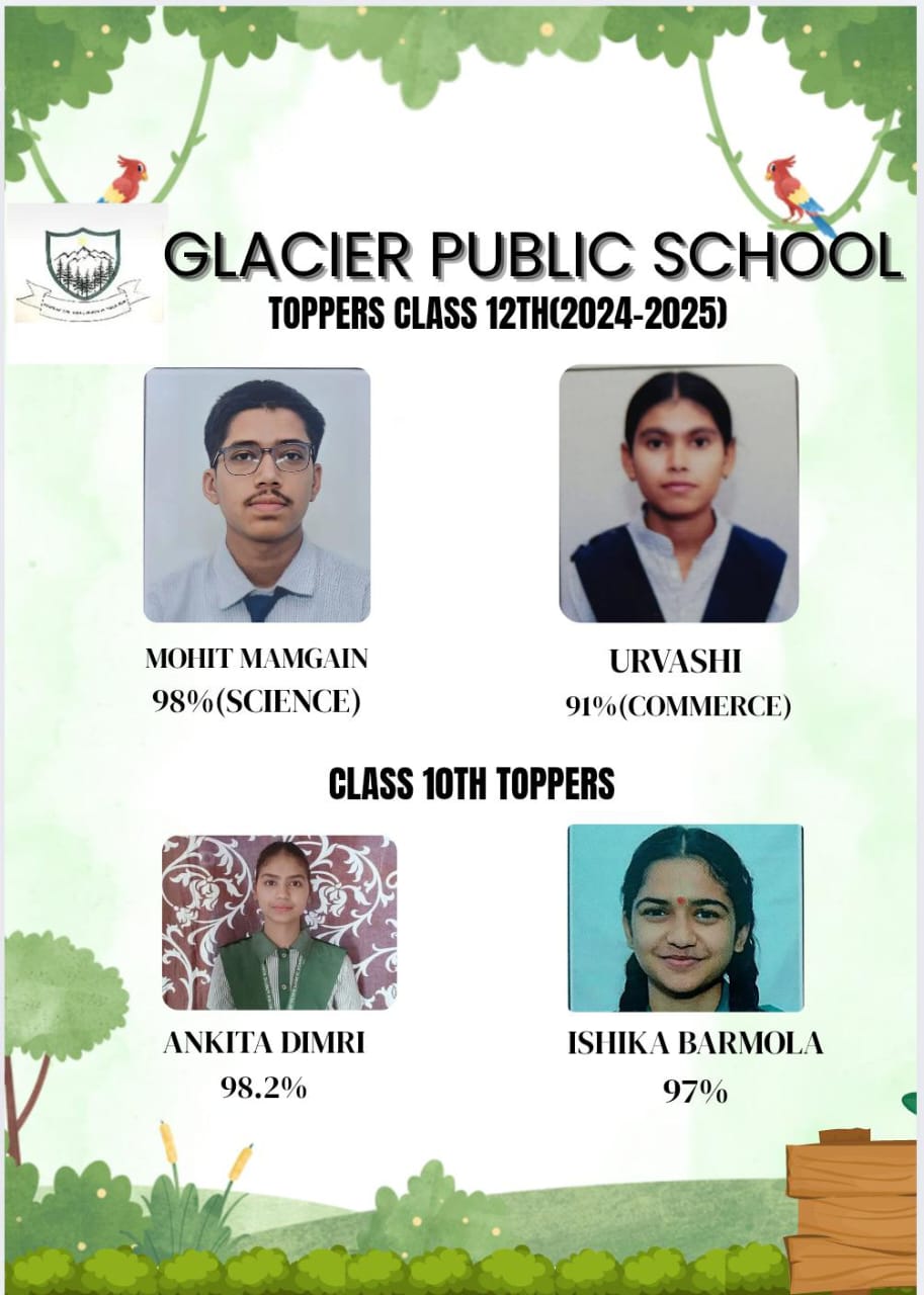 *देहरादून, ।:* Glacier public school तुनवाला आज खुशी का माहौल रहा जब सीबीएसई कक्षा 10 और 12 के बोर्ड परीक्षा परिणाम घोषित हुए। कक्षा 10 में अंकित डिमरी ने 98.2% अंकों के साथ प्रथम स्थान प्राप्त किया। उनके बाद इशिका बरमोला ने 97.% और 12 कि छात्रों ने भी मोहित मंगाई साइंस में 98% और उर्वशी ने कॉमर्स 91% अंको की प्राप्ति की है