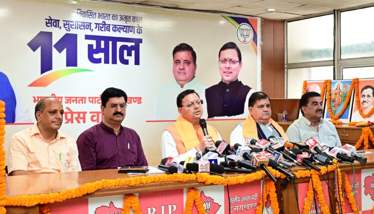 मुख्यमंत्री पुष्कर सिंह धामी ने प्रधानमंत्री श्री नरेन्द्र मोदी के नेतृत्व में केन्द्र सरकार के 11 साल पूर्ण होने पर मुख्यमंत्री ने भाजपा कार्यालय में मीडिया से वार्ता करते हुए कहा कि