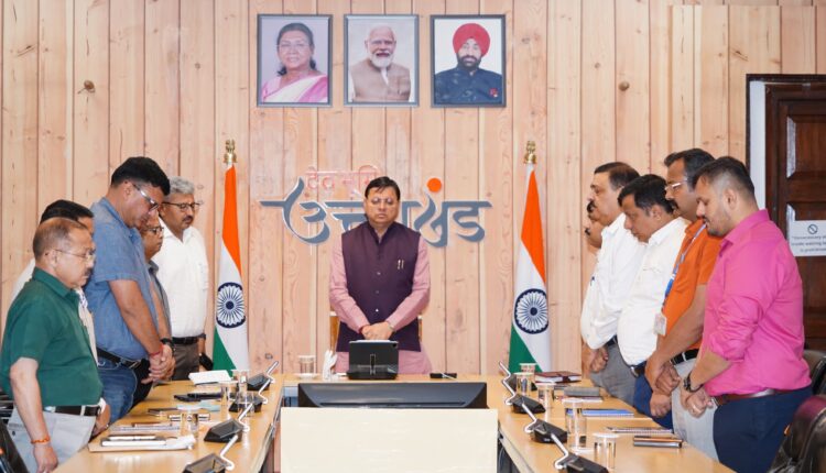 मुख्यमंत्री पुष्कर सिंह धामी ने शुक्रवार को मुख्यमंत्री आवास में उच्च अधिकारियों के साथ बैठक के दौरान गुजरात के अहमदाबाद में हुए विमान हादसे में जान गंवाने वालों को श्रद्धांजलि दी