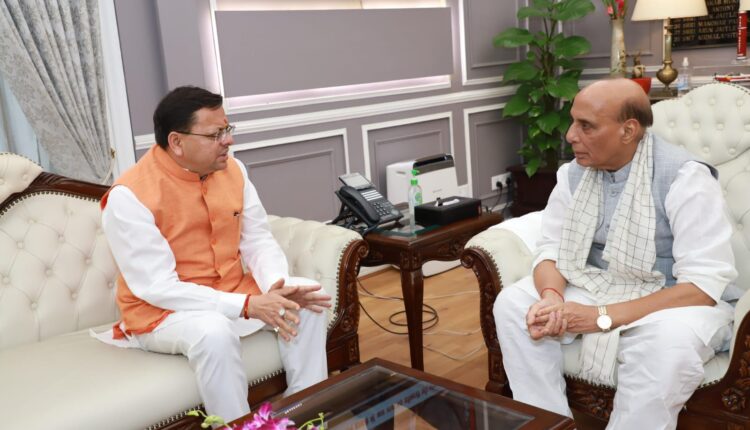 देहरादून। मुख्यमंत्री पुष्कर सिंह धामी ने मंगलवार को नई दिल्ली में केंद्रीय रक्षा मंत्री राजनाथ सिंह से भेंट कर राज्य से जुड़े महत्वपूर्ण विषयों पर चर्चा की। मुख्यमंत्री ने केन्द्रीय रक्षा मंत्री से रानीखेत और लैंसडाउन छावनी क्षेत्र को नगर पालिकाओं के साथ विलय करने का अनुरोध किया। जिससे इन क्षेत्रों में पर्यटन एवं जनसुविधाओं के समग्र विकास में सहयोग मिलेगा। धारचूला और जोशीमठ के सैन्य हेलीपैड को आरसीएस हवाई सेवा के अंतर्गत उपयोग करने के लिए अनुमति प्रदान करने का आग्रह किया। राज्य के आपदा एवं राहत कार्यों के लिए भारतीय वायुसेना की सेवाओं के लिए देय शुल्क को माफ किये जाने का भी मुख्यमंत्री ने अनुरोध किया।