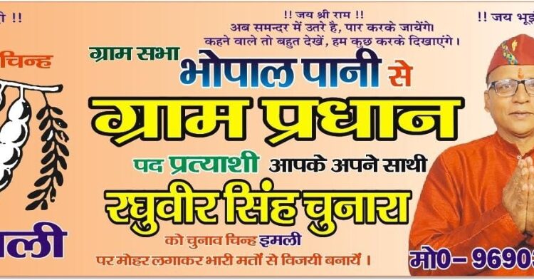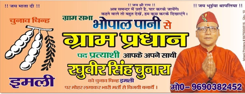 ग्राम सभा भोपाल पानी में अन्य प्रत्याशी के चुनाव लड़ने से ग्रामवासी में इतनी खुशी नहीं है जितनी खुशी रघुवीर सिंह के चुनाव लड़ने से ग्राम वासियों में खुशी की लहर दौड़ती नजर आ रही है रघुवीर सिंह अन्य प्रत्याशियों से अधिक संघर्षील व्यक्ति के रूप में उभरे हैं इस बार ग्राम वासियों का कहना है की रघुवीर सिंह को अधिक से अधिक भारी मतों से विजय बनाकर ग्राम सभा भोपाल पानी का ग्राम प्रधान बनाना है तभी हमारे गांव का विकास तेजी से गतिमान होगा।