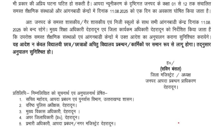 अतः जनपद के समस्त शासकीय / गैर शासकीय एवं निजी स्कूलों के साथ सभी आंगनबाडी केन्द्र दिनांक 11.08. 2025 को बन्द रहेंगे। मुख्य शिक्षा अधिकारी देहरादून एवं जिला कार्यकम अधिकारी देहरादून को निर्देशित किया जाता है कि उपरोक्त समस्त शैक्षणिक संस्थाओं एवं आंगनबाड़ी केन्द्रों में उक्त आदेश का अनुपालन कराना सुनिश्चित करायेंगे। यह आदेश न केवल विद्यालयी छात्र/छात्राओं अपितु विद्यालय प्रबन्धन / कार्मिकों पर समान रूप से लागू होगा। तद्नुसार अनुपालन सुनिश्चित हो।