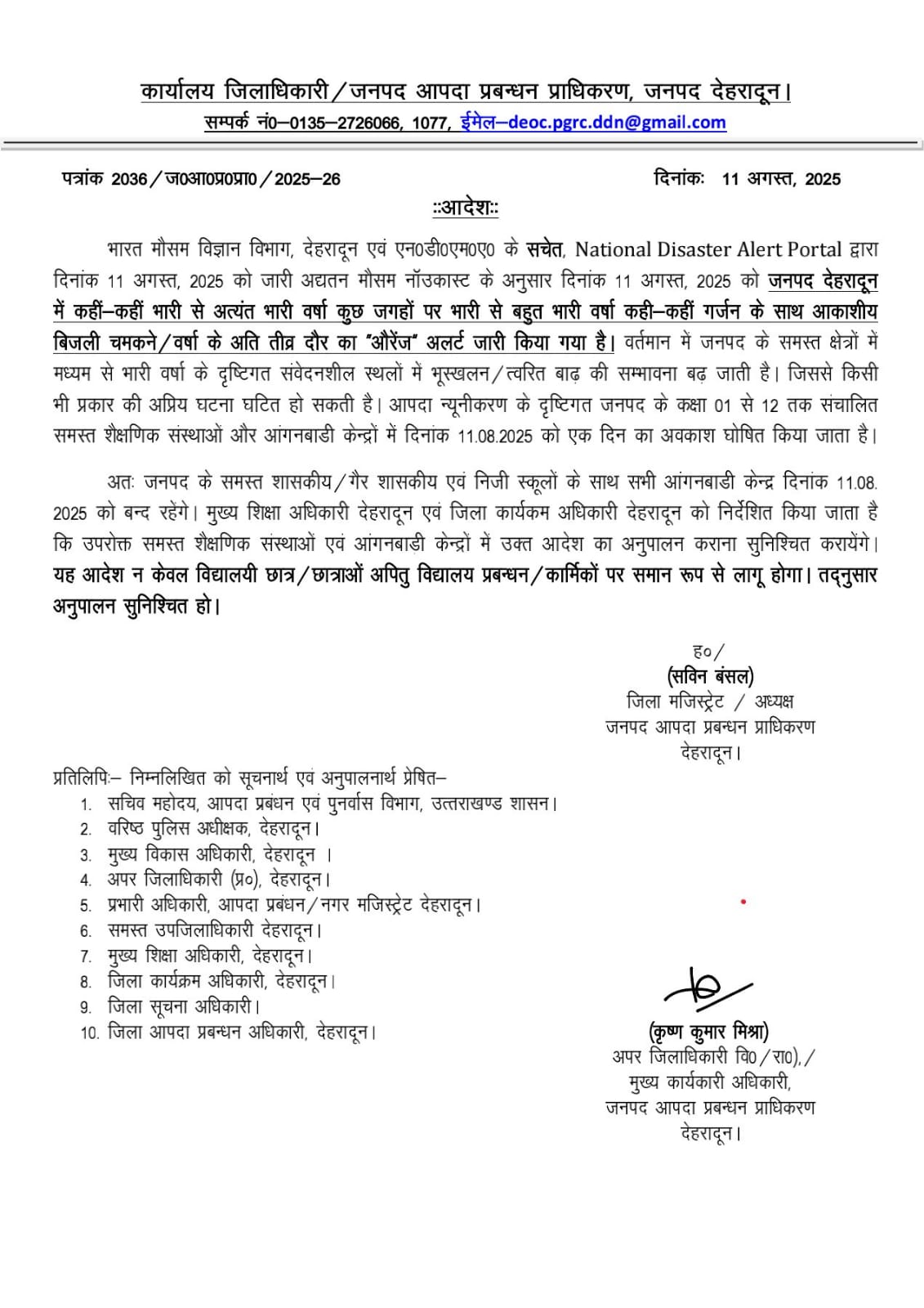 भारत मौसम विज्ञान विभाग, देहरादून एवं एन०डी०एम०ए० के सचेत, National Disaster Alert Portal द्वारा दिनांक 11 अगस्त, 2025 को जारी अद्यतन मौसम नॉउकास्ट के अनुसार दिनांक 11 अगस्त, 2025 को जनपद देहरादून में कहीं-कहीं भारी से अत्यंत भारी वर्षा कुछ जगहों पर भारी से बहुत भारी वर्षा कही कहीं गर्जन के साथ आकाशीय बिजली चमकने/वर्षा के अति तीव्र दौर का “औरेंज’ अलर्ट जारी किया गया है। वर्तमान में जनपद के समस्त क्षेत्रों में मध्यम से भारी वर्षा के दृष्टिगत संवेदनशील स्थलों में भूस्खलन / त्वरित बाढ़ की सम्भावना बढ़ जाती है। जिससे किसी भी प्रकार की अप्रिय घटना घटित हो सकती है। आपदा न्यूनीकरण के दृष्टिगत जनपद के कक्षा 01 से 12 तक संचालित समस्त शैक्षणिक संस्थाओं और आंगनबाडी केन्द्रों में दिनांक 11.08.2025 को एक दिन का अवकाश घोषित किया जाता है।
