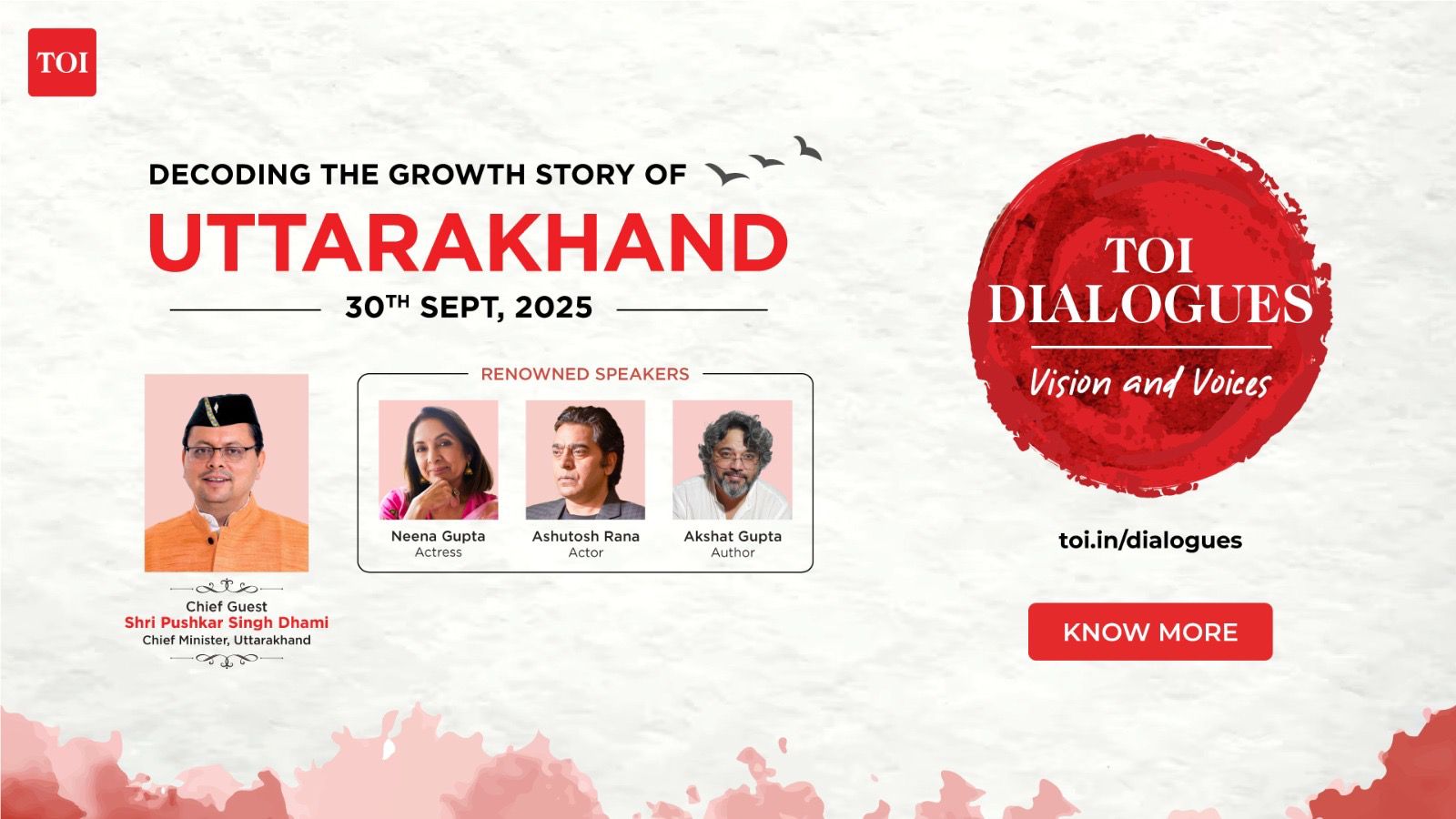 देहरादून, । – टीओआई अपने मुख्य कार्यक्रम टीओआई डायलॉग्स उत्तराखंड का एक खास आयोजन 30 सितंबर, 2025 को फेयरफील्ड बाई मैरियट, देहरादून में करेगा। इस कार्यक्रम का विषय “देवभूमि में धर्म, संस्कृति और कला” है, जिसमें फिल्म, साहित्य, खेल और सरकार से जुड़े जाने-माने लोग मिलकर उत्तराखंड की समृद्ध परंपरा और उज्ज्वल भविष्य का जश्न मनाएंगे।