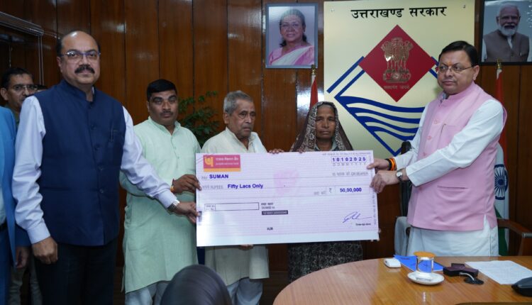 मुख्यमंत्री पुष्कर सिंह धामी ने शुक्रवार को सचिवालय में 50-50 लाख की सहायता राशि के चेक प्रदान किये।